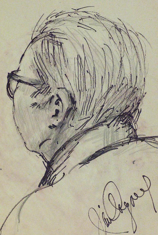 Several years later, she visited her father who lived in Twentynine Palms. She met her father while his was painting in his studio with his friend and neighbor, James Cagney. John did not know Kathi had met Cagney years earlier, and as John was proudly introducing Kathi to his famous guest, Jimmy interrupted and said while embracing Kathi, "Katy my dear!" The photo above was taken that same day, and show's Cagney sketching while observing John painting.